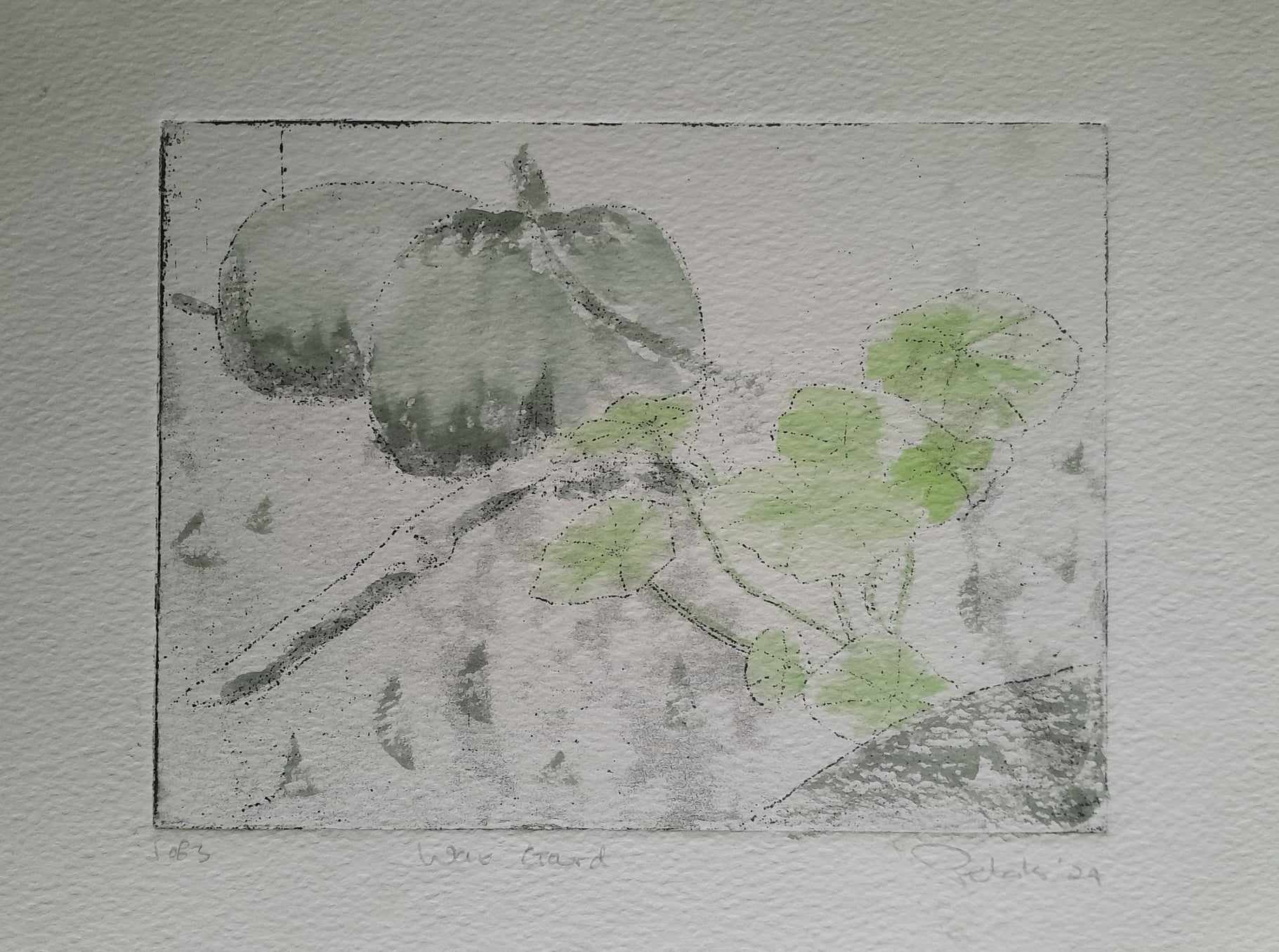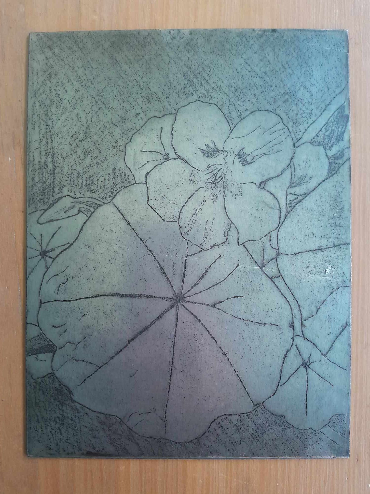 Aluminium plate, soft ground application, image transferred, etched with copper sulphate mordant, partial strength solution etched for five minutes. Flowers and leaves painted with shellac stop out, etched for a further five. NFS