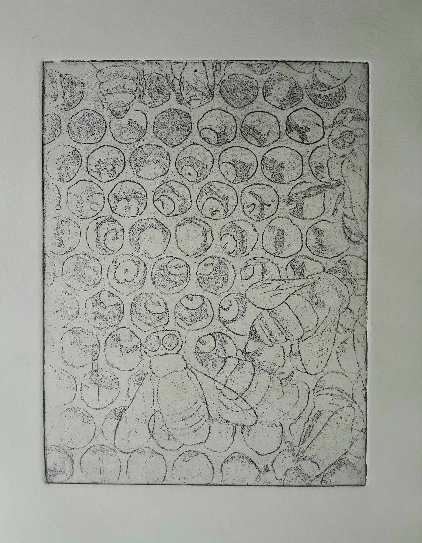 Reaching way past my skill level to attempt a complex line, multiple aquatint print. Turned out better than expected. Next try would be better to use more shellac stop out to keep the bee larvae smooth from the first etch. NFS