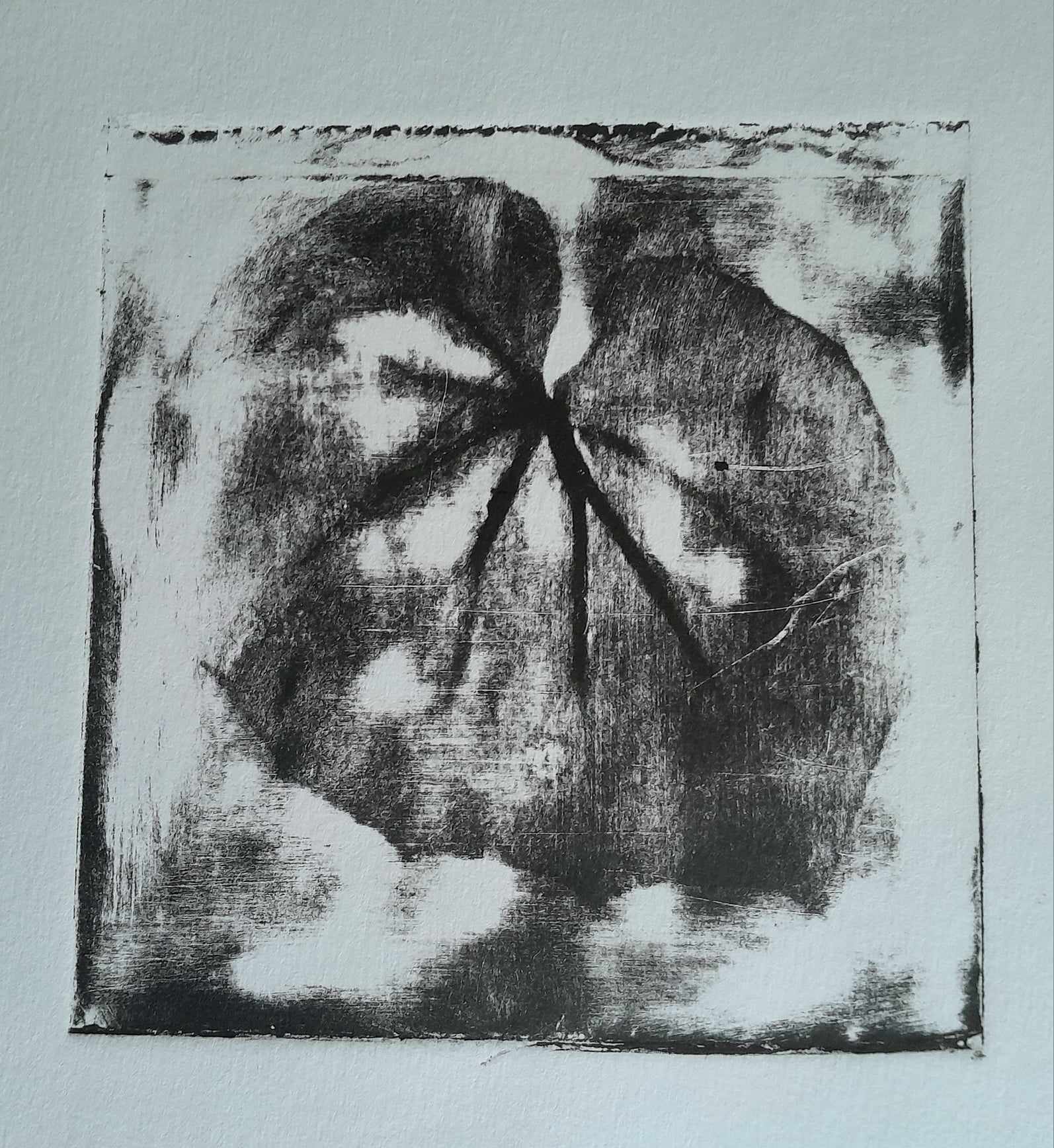 Leaf imprint, run through the press at 3.5 pressure to be embossed onto a foam board. Test to see if the plate could produce an intaglio print. Could only produce one print before the plate was unusable. NFS